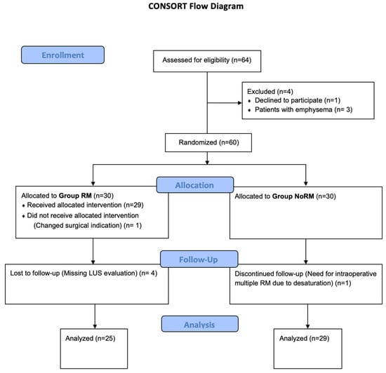A total of 60 patients were randomly assigned to the two groups. In Group RM, one patient was excluded due to their surgery changing to an open procedure, and four patients were excluded due to missing intraoperative LUS evaluations. One patient was excluded from Group NoRM due to the need for multiple RMs. Accordingly, 25 patients in Group RM and 29 patients in Group NoRM were included in the final analyses. The CONSORT diagram is presented in Figure 2. The demographics of the two groups were similar, including postoperative pulmonary complications, room air test positivity in the PACU, surgery and anesthesia duration, ARISCAT scores, and total administered fluid parameters (Table 1).