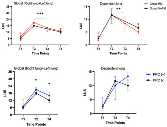 Both lungs and dependent lung median Lung Ultrasound Scores at different time points. LUS: Lung Ultrasound Score; RM: recruitment maneuver; PPC: postoperative pulmonary complication; T1: 5 min after intubation; T2: at the end of surgery before recruitment maneuver (in Group RM) or at the end of surgery before extubation; T3: after recruitment maneuver but before extubation; T4: 30 min after extubation in Post-Anesthesia Care Unit. * p < 0.05 and ** p = 0.002 (in comparison of T2 LUS in Group NoRM versus T3 LUS in Group RM); *** p < 0.001 (in comparison of T2 LUS in Group NoRM versus T3 LUS in Group RM).