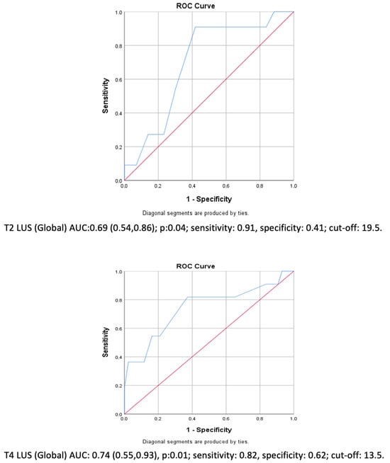 On the other hand, the whole group’s pre-extubation global LUS (T2 in Group NoRM and T3 in Group RM) ROC analyses exhibited 91% sensitivity for predicting PPCs (area under the curve: 0.69 (0.54, 0.86); cut-off LUS: 19.5 (p = 0.04)). Similarly, the postoperative (T4) global LUS evaluation could also predict PPCs with a sensitivity of 82% (area under the curve: 0.74 (0.55, 0.93); cut-off LUS: 13.5 (p = 0.01)) (Figure 4). If these cut-off values are used to separate the whole group, the patients with a pre-extubation LUS more than 19 would have a 10-fold higher risk for a PPC (OR: 10.2; 95% CI: (1.14, 91.2); p = 0.04). However, using a “postoperative” LUS cut-off value of 13 did not result in a significant difference (p = 0.06) (Table 2).