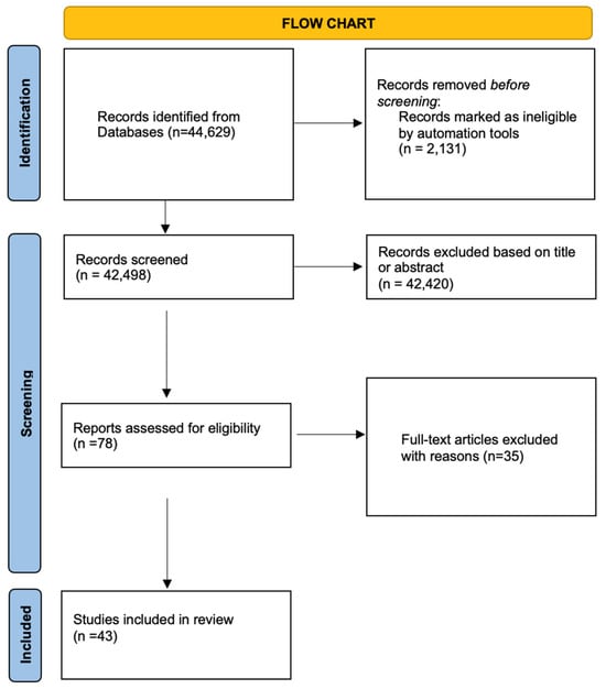 A total of 44,629 articles were yielded by the initial database search. Two independent reviewers screened the results, excluding 2131 case reports and 42,420 articles based on their titles. Of the remaining 78 articles, 35 were excluded after applying the eligibility criteria. Articles had to be full-length research papers written in English, whereas abstracts presented at scientific meetings and review articles were excluded. In addition, only those studies were included that provided information specifically on the malignant transformation of endometriosis. This means that studies with a random diagnosis of cancer among endometriosis patients were excluded. After this strict screening, 43 articles fulfilled the eligibility criteria for inclusion in the review, as outlined in Figure 1. The risk of bias was assessed using the ROBINS-I tool, which evaluates seven domains including confounding, selection of participants, classification of exposures, deviations from intended interventions, missing data, measurement of outcomes, and selection of the reported result.