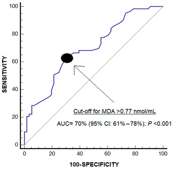 The area under the curve for the diagnosis of periodontitis by salivary malondialdehyde levels was 70% (95% CI = 61–78%; p < 0.001) (Figure 1). The malondialdehyde levels > 0.77 nmol/mL showed a sensitivity of 63% (50–75%), a specificity of 70% (56–81%), a positive likelihood ratio of 2.1 (1.4–3.2), a negative likelihood ratio of 0.5 (0.4–0.8), a positive predictive value of 70% (60–79%) and a negative predictive value of 63% (54–71%) for the diagnosis of periodontitis.