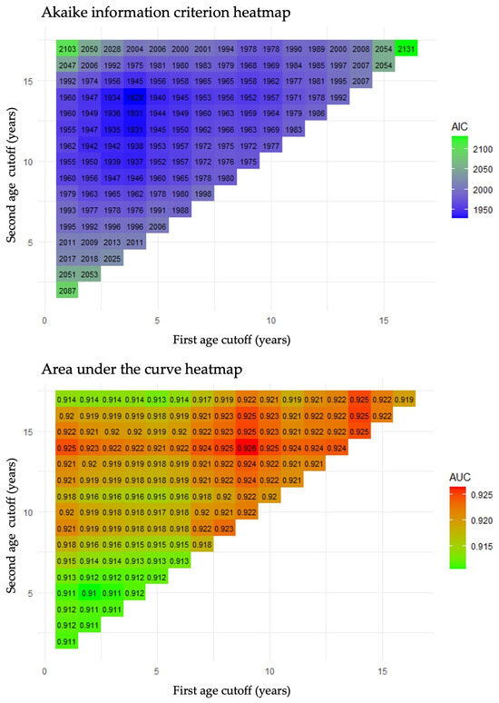 Figure 2 illustrates how different combinations of two- and three-group age cutoffs influence the predictive performance of the rSIG for in-hospital mortality, presented in the form of AIC (top) and AUC (bottom) heatmaps. In the AUC heatmap, colors closer to red indicate a stronger discriminatory performance, whereas, in the AIC heatmap, darker shades of blue indicate a better model fit. When dividing the population into two age groups, the optimal age range to achieve the highest AUC (0.925) was ≤14 years, while the age range that achieved the lowest AIC (1977) was ≤10 years. When using three age groups, the optimal ranges for the highest AUC (0.926) were ≤9 years and ≥15 years, whereas the boundaries for the lowest AIC (1928) were ≤4 years and ≥15 years.