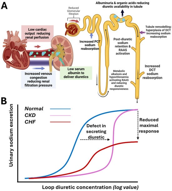 (A) Multifactorial causes of diuretic resistance (green dots represent loop diuretic and blue dots represent albumin forming complexes with the loop diuretic; The red arrow indicates forward perfusion and blue arrow indicates increased venous pressure. Black arrow indicates direction of natriuresis through the tubule, with dark blue arrow indicating strong factor for diuretic resistance, vs purple arrow to suggest moderate factor for diuretic resistance and blue arrow to indicate weak-moderate factor). (B) Dose–response curve with rightward and downward shift in heart failure (figure is original and created by author PT).