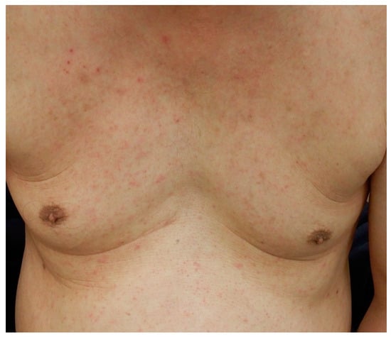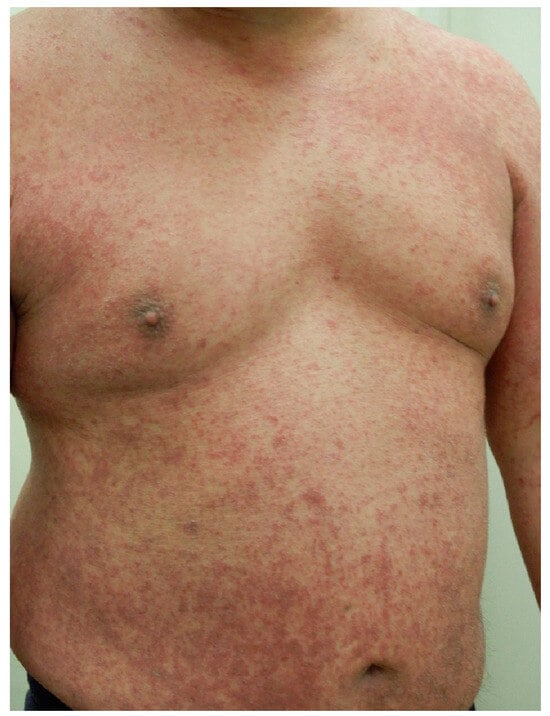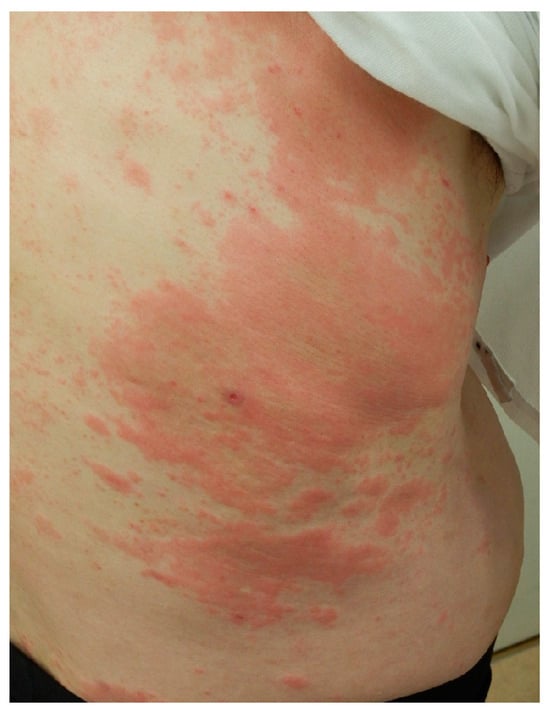 - Ohtsuka, T. Pityriasis rosea-like arranged eruption after infliximab therapy in a patient with psoriasis vulgaris. J. Dermatol. 2014, 41, 354–355. [Google Scholar] [CrossRef] [PubMed]