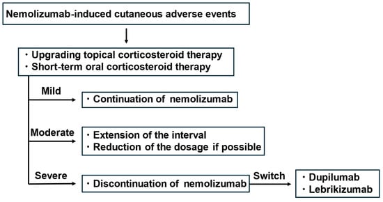 - Sugiyama, A.; Yano-Takamori, A.; Kojima, K.; Nishie, H.; Nishimura, M.; Hiramoto, T.; Nakahara, T. Characteristics of suitable cases for treatment with nemolizumab based on clinical findings and cutaneous adverse events. J. Dermatol. 2025, 52, 740–743. [Google Scholar] [CrossRef]