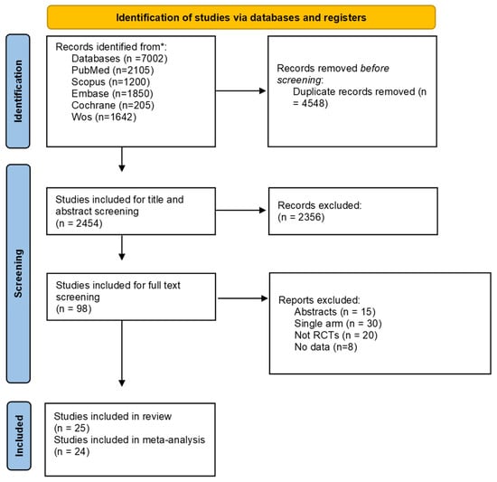 Our primary literature search, using our search strategy on different databases, yielded 7002 citations, of which 4548 duplicates were removed, 2454 articles were screened in the titles and abstracts screening step, ending up with 98 articles that were screened in the full-text screening stage. Finally, 25 RCTs were included in our study. After reviewing the references in the included articles, we found that no additional studies met our inclusion criteria. One study was included in the systematic review but excluded from the meta-analysis due to insufficient quantitative data for statistical pooling (Figure 1).