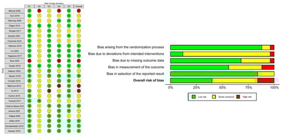 Using the ROB2 tool, ten studies were identified with a low risk of bias [12,16,17,18,20,22,30,31,32,33]. Most of the studies were of moderate quality [10,11,13,14,15,21,23,26,27,28,29]. While four studies exhibited a high risk of bias [9,19,24,25], as illustrated in Figure 2.