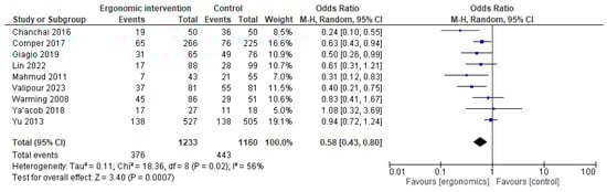 While analyzing the reported improvement in pain in the lower back, we found a significant improvement in ergonomics compared to controls, with a pooled OR of 0.58 [95% CI: 0.43, 0.80]; p = 0.0007, indicating a protective effect for ergonomics. Heterogeneity was moderate among the included studies with I2 = 56% (Figure 3).