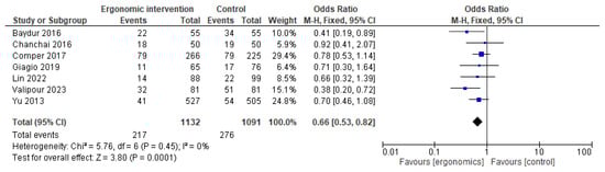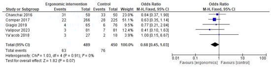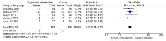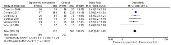For upper back pain, ergonomics had a significant protective effect on reported pain, with an overall OR of 0.61 [95% CI: 0.47, 0.79]; p = 0.0002. There was no heterogeneity among the included studies, as shown in Figure 4.