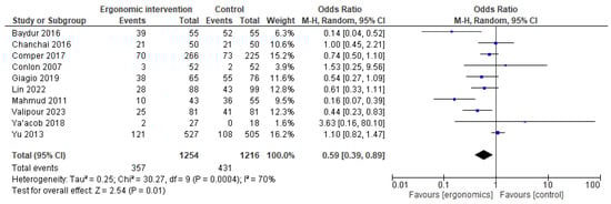 The impact of ergonomic interventions on neck pain was interesting, with a protective effect. The pooled analysis showed a trend toward pain reduction. The OR was 0.59 [95% CI: 0.39, 0.89]; p = 0.01. Heterogeneity was high (I2 = 70%), indicating inconsistency among studies, as illustrated in Figure 5.