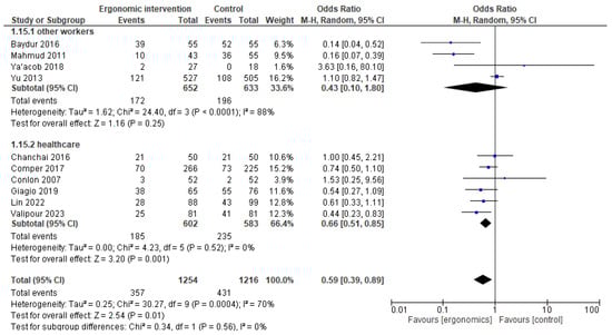 A subgroup analysis was conducted based on the workplaces of healthcare workers or others. Interestingly, no heterogeneity among healthcare workers’ studies was found, with no change in the overall context of results, indicating a significantly better effect with ergonomics. In contrast, in the other group, heterogeneity was high, with I2 = 88%. A change in the results shows no difference between ergonomics and controls with p = 0.25, as illustrated in Figure 6.