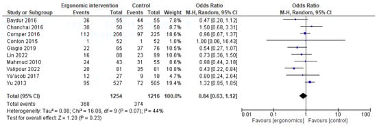For shoulder pain, ergonomic interventions showed no statistical difference from controls (OR = 0.84 [95% CI: 0.63, 1.12]; p = 0.23), with moderate heterogeneity (I2 = 44%), as illustrated in Figure 7.