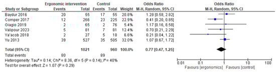 Similarly, ergonomic interventions did not show any significant reduction in reported elbow pain (OR = 0.77 [95% CI: 0.47, 1.25]; p = 0.29), with moderate heterogeneity (I2 = 40%), as shown in Figure 8.