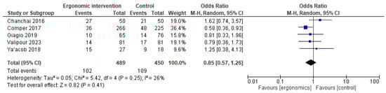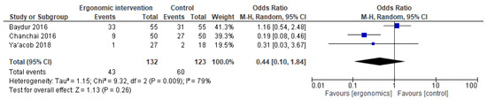 Interestingly, when sensitivity analysis was performed in knee analysis, by excluding Chanchai et al., heterogeneity was resolved, with a significant change in the overall results, showing that the ergonomics arm had a lower reported knee pain rate than the controls with p = 0.04, as shown in Table 2.