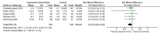 Several studies included in the meta-analysis assessed functional disability scores following ergonomic interventions. The pooled analysis demonstrated no differences in disability scores between the ergonomic group and controls, with SMD of −0.13 [95% CI, −0.28, −0.03; p = 0.10). There was no heterogeneity among studies, with I2 = 0%, as illustrated in Figure 15.