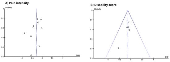 Funnel plot evaluating publication bias regarding pain intensity and disability scores.