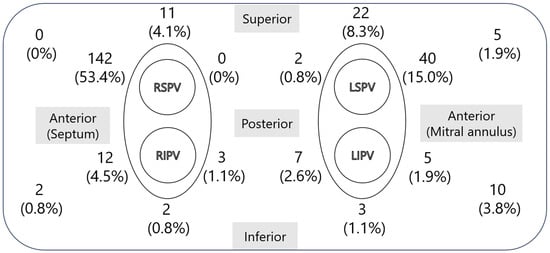 The prevalence and location of the LAD in all patients were investigated. The location of the LAD was characterized on the basis of the atrial wall and classified into 16 segments: right superior, left superior, right inferior, left inferior, right upper posterior, right lower posterior, left upper posterior, left lower posterior, right upper anterior, right lower anterior, left upper anterior, left lower anterior, upper septum, lower septum, upper lateral, and lower lateral. The number and percentage of each segment are illustrated in the figure.