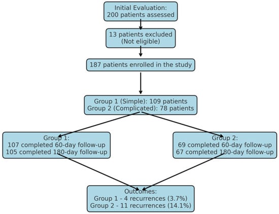 In the complicated group, 78 patients were initially enrolled; however, 69 of them attended the follow-up at day 60, and 67 completed the final follow-up at day 180. Similarly, in the simple group, out of 109 patients, 107 completed the 60-day evaluation, and 105 reached the 180-day follow-up. The loss of participants in both groups was attributed to patients who failed to complete their scheduled follow-up visits.