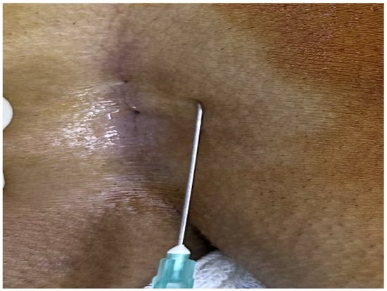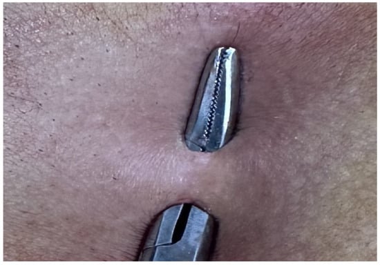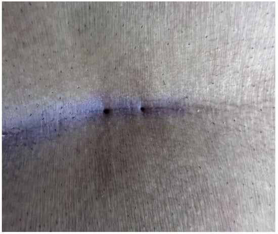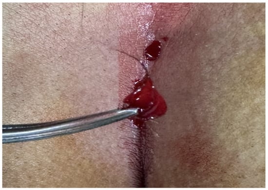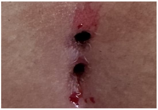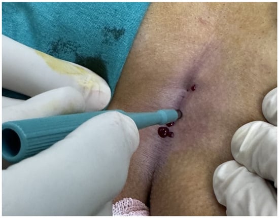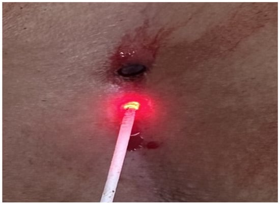 The patients were operated on under local anesthesia in the operating room under appropriate field cleaning and sterile conditions, in the jackknife position. Prilocaine hydrochloride was used for local anesthesia. A single dose of cefazolin sodium was administered intravenously to the patients. The external sinus openings were excised using a 4 mm punch biopsy needle. After pit excision, the sinus cavity was cleaned with saline solution. The tissues within the sinus cavity were debrided using a specialized brush. Subsequently, the sinus cavities were uniformly closed using a diode laser probe (1470 nm, 10 watts, 3 s, 30 joules). The procedure was concluded by applying a dressing containing sodium fusidate ointment. Pain scoring was performed one hour postoperatively, and intravenous paracetamol was administered to all patients. The patients were discharged two hours later with a prescription for oral antibiotics (Figure 2, Figure 3, Figure 4, Figure 5, Figure 6, Figure 7, Figure 8, Figure 9, Figure 10 and Figure 11).
