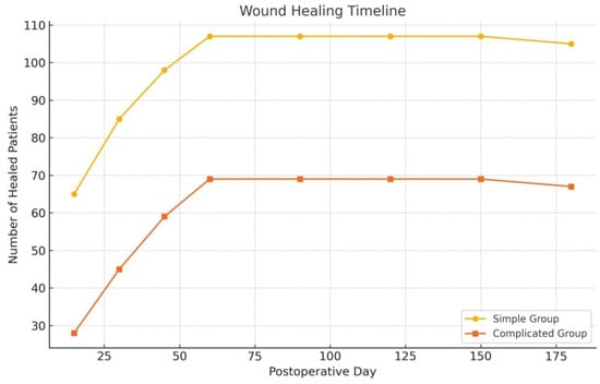 Postoperative pain scores were significantly lower in the simple group (p = 0.037), supporting the efficacy of limited tissue damage and minimally invasive techniques. Wound-healing duration also differed substantially: the simple group demonstrated a mean healing time of 16.74 ± 2.54 days, compared to 27.99 ± 2.85 days in the complicated group (p < 0.001). These findings suggest that laser therapy facilitates accelerated recovery in early-stage disease. Recurrence rates were 3.7% in the simple group and 14.1% in the complicated group (p = 0.010). This discrepancy likely stems from the higher number of sinus orifices and prior surgical interventions in complicated cases, which may impair healing efficacy.