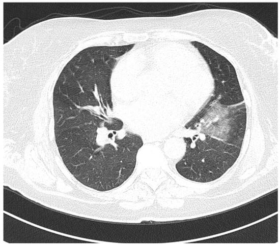 Initial chest computed tomography (CT) with contrast revealed a ground glass opacity (GGO), measuring 41 × 44 mm and located at the level of medial and anterior basal segments of the lower left lobe, that was associated with cylindrical projections inside (Figure 1). A fibrous band was observed adjacent to the GGO indicating mitral valve chordae. Additionally, 13 × 15 mm mediastinal adenopathy was observed in the right paratracheal lymph nodes. The tracheo-bronchial tree was free, and the thoracic artery was permeable with normal caliber. Most importantly, the pulmonary arteries were of normal caliber and were homogeneously opaque without intraluminal thrombi.