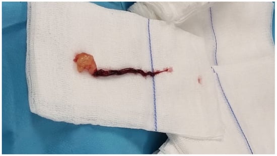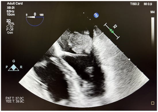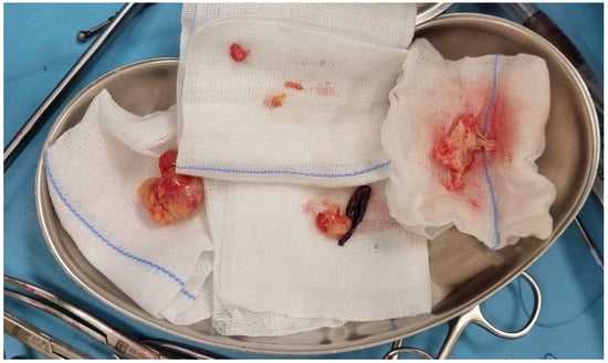 Considering the recent symptomatology of stroke of <12 h and the proof of left carotid embolus, we decided to intervene immediately, first to establish the normal cerebral perfusion and then to remove the intracardiac mass. The embolus was situated in the aortic arch, appeared fragile on the ultrasound images, and posed a significant risk of further embolization to the carotid artery or other cerebral vessels. Therefore, we believed that conducting an open arch procedure, which would allow us to maintain complete control over the cerebral vessels while minimizing additional manipulation, was the safest approach. To excise the mass safely, we initiated extracorporeal circulation through central cannulation and started rapid deep cooling to 18 °C. Meanwhile, we made a laterocervical incision to have the left common carotid artery exposed and clamped at the time of circulatory arrest to prevent distal embolization to the brain. When we reached 18 °C, we stopped the extracorporeal circulation and incised the aortic arch to better visualize the origin of cerebral vessels and to safely extract the embolus with the left carotid clamped. The embolus was floating in the aortic arch and occluded the carotid artery (Figure 6). The embolus was easily extracted, and the carotid artery was flushed to remove any small debris left. We first closed the aortic arch, restarted the extracorporeal circulation, and warmed the patient. Simultaneously, we de-aired and closed the left carotid artery. NIRS monitoring of the brain was normal throughout the procedure. While the patient was warmed, we entered the left atrium through the interatrial groove and visualized the tumor that included P2 and had a dynamic obstruction of the mitral orifice. We excised the posterior and anterior cusps and took into consideration the preserving of parts of the mitral subvalvular apparatus, but we also observed smaller tumors on the posteromedial papillary muscle and chordae, so we decided to take out the whole subvalvular apparatus as well (Figure 7). After a prior discussion with the family, we implanted a 29 mm biological valve given her neurological status and prognosis. After the mitral prosthesis implantation and reaching 36.5 °C, we finished the procedure in a standard fashion. TEE showed moderate LV dysfunction and normal mitral prosthesis with no leak.