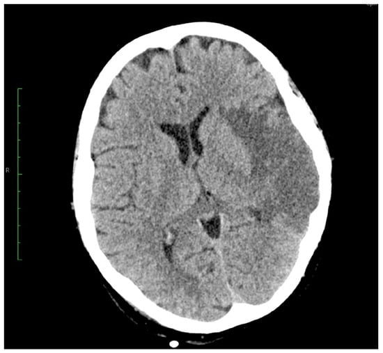 To follow up on cerebral attacks, a cranial CT was performed three days post-op (Figure 8) which showed hyperdense left M2 with hypodense lesion with ischemic appearance. However, no ischemic lesions were observed in the right cerebral or cerebellar hemisphere, and no intracranial blood accumulation were observed.