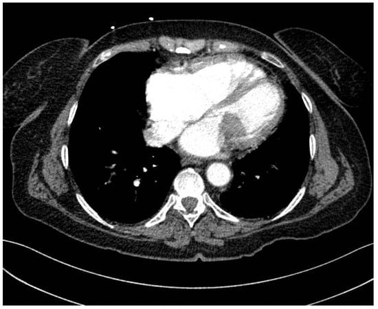 The patient experienced transitory neurological dysfunctions, and a confirmatory contrast CT was performed. Cranial CT showed a hyperdense left M2 with hypodense lesion with ischemic appearance (Figure 3). The thoracic CT scan showed a 3.6 × 2.6 cm hypodense nodule at the center of mitral valve, with extension toward the aortic valve (Figure 4). Furthermore, a new occlusion in the left internal carotid artery was observed due to a thrombus (at least 5 cm) starting from its emergence from the aorta (Figure 5). Pulmonary arteries were permeable. We used a GE Healthcare Japan Corporation, Tokyo, Japan, model Optima CT660, year of fabrication 2015 to perform the emergency scan.