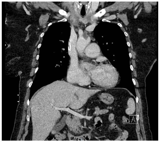 CT images of the thoracic coronal section showing the extension of the nodule into the aortic valve and embolus in the aortic arch.