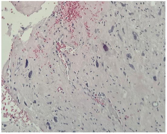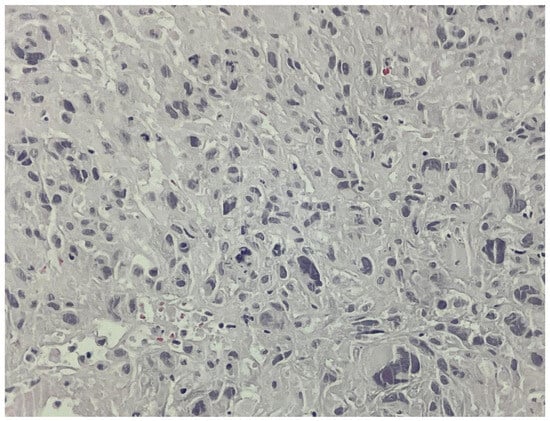 Three separate tissue samples (left atrium, mitral valve, and papillary muscle) were extracted, and their histopathology was investigated by immunohistochemistry (IHC). All samples tested positive for tumoral aspects, and the IHC supported the diagnosis of undifferentiated pleomorphic sarcoma (FNCLCC Grade 3). Figure 9 and Figure 10 show malignant tumor proliferation, characterized by spindle-shaped epithelioid and stellate cells, with marked nuclear pleomorphism, as well as frequent bizarre giant cells that were occasionally multinucleated. Mitotic activity is noted at 16 mitoses per 10 high-power fields (HPF), with the presence of tumor necrosis and extensive coagulative necrosis. Vascular invasion is evident (LV1), and tumor characteristics are observed at the margins of the fragments.