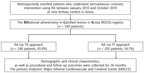From January 2010 to October 2019, this study enrolled 540 patients with heavily calcified coronary artery disease (CAD) who underwent PCI using RA at nine tertiary centers in Korea. The data were derived from the Rotational Atherectomy in Calcified Lesions in Korea (ROCK) registry, approved by the institutional review board of each participating hospital. Patients with severely calcified coronary lesions and significant stenosis (defined as ≥70% of the vessel diameter, or ≥50% for the left main coronary artery) were retrospectively identified through institutional databases. Following angiographic assessment, two lesions were excluded from the registry because the RA procedure could not be carried out. In one case, coronary perforation accompanied by cardiac tamponade occurred prior to the initiation of RA. In the other, advancement of the guidewire across the target lesion was unsuccessful, making RA unfeasible. The lesions were categorized into two groups: transradial approach (n = 248 patients) and transfemoral approach (n = 292 patients). Data collection at each center followed a standardized case report form, capturing demographic and clinical characteristics, procedural details, and follow-up information. Follow-up data covering up to 36 months were obtained from medical records and physician or patient interviews conducted at the time of registry enrollment. The study was conducted in accordance with the Declaration of Helsinki and was approved by the Institutional Review Board (IRB) of Daejeon St. Mary’s Hospital (Approval Code: DC19REDI0066, approved on 30 July 2019).
