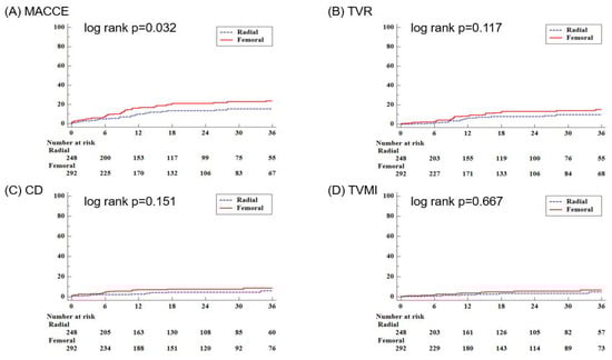 Figure 2 shows the Kaplan–Meier curve for clinical outcomes during follow-up. During the 36-month follow-up period, MACCE showed a statistically significant difference between the two groups with a p-value of 0.032. No significant differences were observed in CD, TVMI, or TVR. However, in the multivariate analysis of MACCE at 36 months, there were no significant differences between the TF approach group and the TR approach group (unadjusted HR: 1.643, 95% CI: 1.038–2.601, p = 0.034; adjusted HR: 1.520, 95% CI: 0.889–2.600, p = 0.126) (Table 4). The secondary endpoints also did not show significant differences (all-cause death: unadjusted HR: 1.124, 95% CI: 0.627–2.013, p = 0.695; adjusted HR: 1.230, 95% CI: 0.610–2.482, p = 0.562; any MI: unadjusted HR: 1.639, 95% CI: 0.654–4.108, p = 0.292; adjusted HR: 1.601, 95% CI: 0.536–4.786, p = 0.400; TLR: unadjusted HR: 1.706, 95% CI: 0.873–3.334, p = 0.118; adjusted HR: 1.245, 95% CI: 0.582–2.663, p = 0.572; ST: unadjusted HR: 2.163, 95% CI: 0.420–11.151, p = 0.356; adjusted HR: 2.224, 95% CI: 0.343–14.414, p = 0.402; CVA: unadjusted HR: 1.301, 95% CI: 0.367–4.610, p = 0.684; adjusted HR: 1.479, 95% CI: 0.230–9.512, p = 0.681; total bleeding: unadjusted HR: 1.280, 95% CI: 0.632–2.592, p = 0.493; adjusted HR: 1.214, 95% CI: 0.526–2.802, p = 0.649).