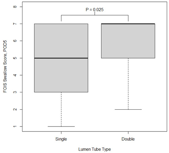 FOIS score: In univariate analysis, participants who had a double-lumen tube had significantly higher FOIS scores (indicating better swallowing function) compared to those with a single-lumen tube (p = 0.035). The median FOIS score on POD 5 in those with a double-lumen tube was 7 (IQR = 2) and in those with a single-lumen tube was 5 (IQR = 4). The distribution of FOIS score on POD 5 by type of lumen tube used is shown in Figure 1.