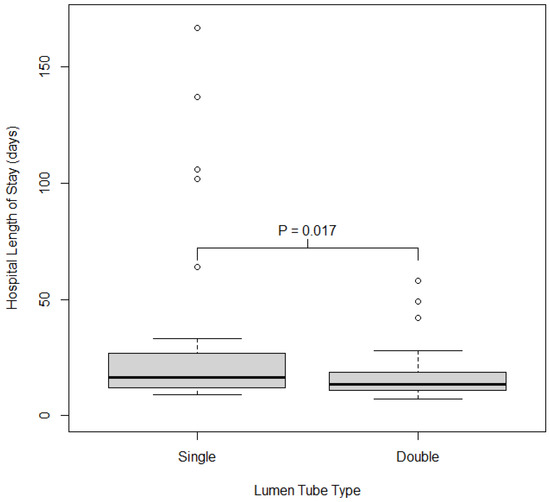 Distribution of hospital length of stay in days by type of lumen tube used. Boxes show the 25th, 50th, and 75th percentiles in each group; whiskers extend 1.5 times the inner quartile range from the median. The p-value reported on the plot is from the Wilcoxon rank sum test comparing HLOS between groups.