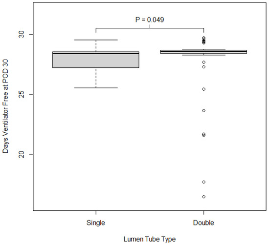 Distribution of days ventilator-free at postoperative day 30 type of lumen tube used. Boxes show the 25th, 50th, and 75th percentiles in each group; whiskers extend 1.5 times the inner quartile range from the median. The p-value reported on the plot is from the Wilcoxon rank sum test comparing FOIS between groups.