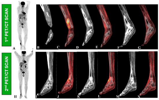 In inflammatory bone diseases, [18F]-FDG-PET offers a non-invasive method to assess the disease’s extent and activity in vivo. Monitoring treatment responses in systemic inflammatory diseases, including bone conditions, poses significant challenges. The ability to rapidly and accurately evaluate therapeutic effectiveness is crucial for the timely discontinuation of ineffective treatments. [18F]-FDG-PET provides a valuable tool, enabling clinicians to visualize and quantify inflammatory activity [37,38,39].