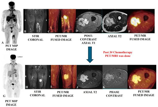 Post-operative case of myosarcoma of the left mid-thigh in a 45-year-old male evaluated using PET/MRI SCAN (upper row); the scan showed an altered-intensity heterogeneously enhanced bulky residual mass with lobulated, infiltrative margins in the tissue planes, which is well depicted in the MRI images (B,D,E), as well as increased [18F]-FDG metabolic avidity (A,C,F). A follow-up PET/MRI scan (bottom row) after three cycles of chemotherapy showed residual enhancing altered-intensity soft tissue mass with no gross change in bulk (H,J,K) and moderate regression in avidity (G,I,L), suggesting a partial response.