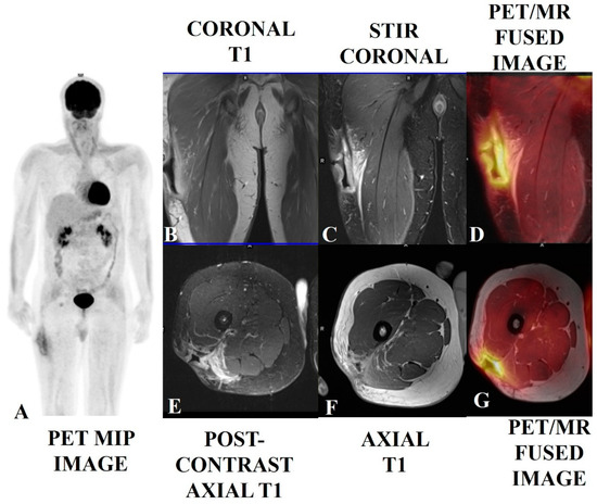 Beyond diagnosis and staging, [18F]-FDG PET-CT is useful in evaluating treatment responses and monitoring for recurrence in STS patients [27,28,29]. It demonstrates superiority in distinguishing between scar tissue and active tumors, proving its effectiveness over traditional imaging methods [30,31,32]. The changes in metabolic activity are more reliable indicators of treatment response than size alterations; for example, a significant decrease in SUVmax after treatment correlates with better clinical outcomes [32,33]. Advancements in combined imaging methodologies, such as PET/MRI, are also showing promise, enhancing the detection and management of STS by integrating metabolic and anatomical data, thereby improving overall patient care [34,35,36]. Figure 2, Figure 3, Figure 4 and Figure 5 provide examples of some representative oncology cases of MSK imaging evaluated with PET (PET/CT or PET/MRI) for staging purposes and/or to assess treatment responses.