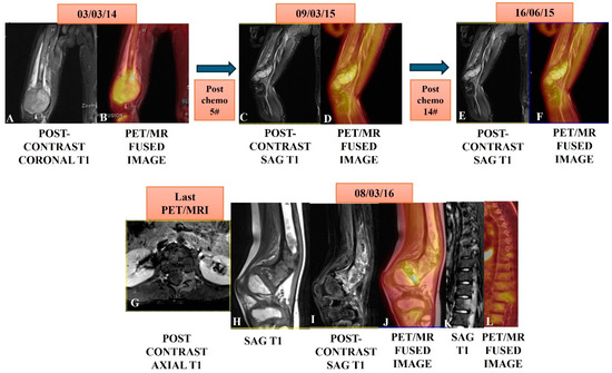 A case of osteosarcoma of the distal right femur in an eight-year-old male child showed an expansile enhancing and metabolically active mass in the distal femur (A,B) in a PET/MRI conducted on 03/03/14. The patient underwent serial PET/MRI studies after five cycles on 09/05/15 and then, after 14 cycles of chemotherapy on 16/06/15, showed marked regression in bulk and near complete metabolic regression in serial scans (C,D,E,F). A follow-up PET/MRI scan was taken after nine months on 08/03/16 and showed residual/recurrent enhancing (H,I) and a metabolically avid marrow lesion (J) in the meta-diaphysis of the distal femur. Note: the [18F]-FDG avid marrow lesion left posterior elements of D9 and L1 (K,L) are suggestive of metastasis with left spinal epidural soft issue extension at the L1 level (G).