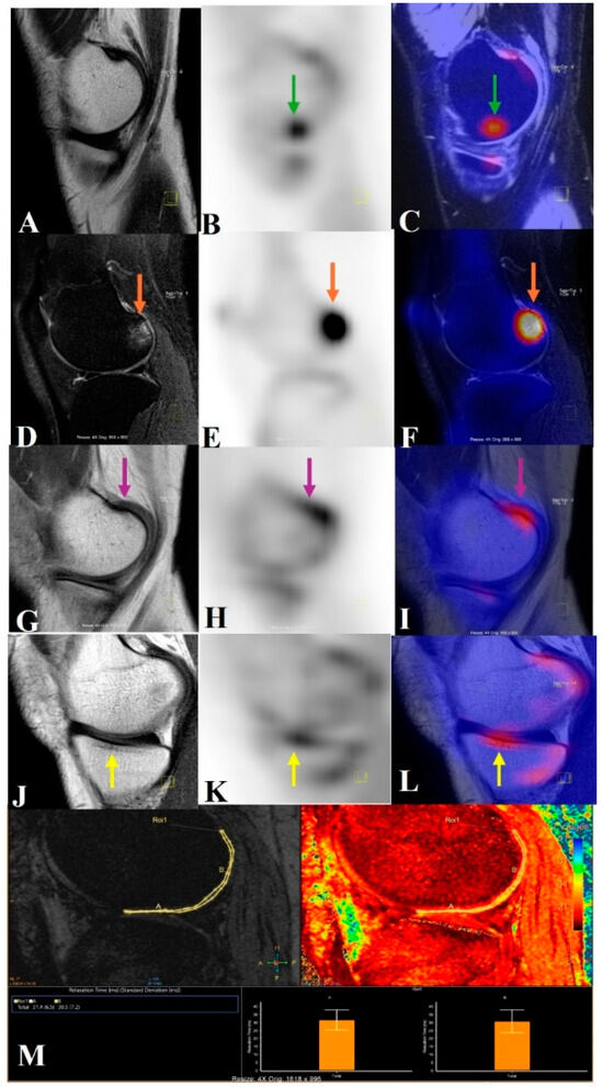 This image illustrates how knees with osteoarthritis can be seen holistically using PET/MRI. A PET/MRI scan of the knee shows high tracer uptake in the medial central femur region (B,C) without any morphological changes (green arrow) (subchondral magic spots) in the corresponding sagittal T2 SPIR (spectral presaturation with inversion recovery) image (A). High signal intensity changes, i.e., grade 2 BML (orange arrow) in the lateral posterior femur on a T2 SPIR image (D), with high tracer uptake on the sagittal PET image (E) also spatially correlated in the fused PET/MRI image (F). Osteophyte in the medial posterior femur (pink arrow) in the T1 TSE image (G), with high tracer uptake in the sagittal PET image (H) also spatially correlated in the fused PET/MRI image (I). Sclerotic changes in the medial central tibial region (yellow arrow) in the T1 TSE image (J), with high tracer uptake in the sagittal PET image (K) also spatially correlated with the fused PET/MRI image (L). The lateral central and posterior femur cartilage had longer relaxation times, according to the T2* relaxometry cartogram superimposed on the sagittal T2 SPIR picture (M).