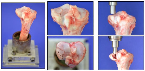 Figure 3). In groups B and C, the fractures were reduced anatomically with the bone adhesive simultaneously filling up the remaining metaphyseal bone defect after lifting of the depressed articular fracture fragment to the articular surface. After first setting the bone glue within 15 min, the same plate osteosynthesis as in group A was performed. As a plate, a typical, often used plate type was chosen (VA-LCP Proximal Tibial Plate 3.5, DePuy Synthes, Johnson&Johnson Medical GmbH, Norderstedt, Germany). All osteosynthesis with the filling of the metaphyseal bone defect was controlled by X-rays before the biomechanical testing. All specimens underwent a hardening in an incubator at 37 °C for 24 h.