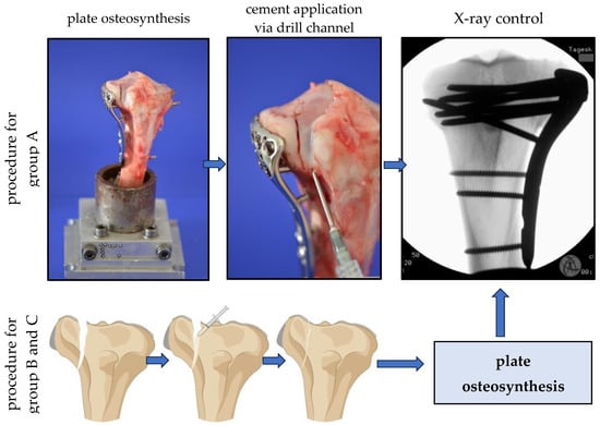 Nine specimens per group were selected randomly into 3 groups, and after the reduction of the simulated split depression fractures, the fractures of the control group (group A) were like the current standard procedure stabilized with a plate osteosynthesis following an application of the hydroxyl apatite forming bone cement (alpha TCP) (see