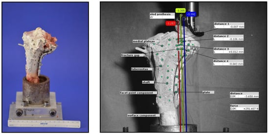 Before starting the biomechanical loading, the bone, the fixation device, and the load indentor were equipped with markers by the optical system (ARAMIS 3D Professional, Carl Zeiss GOM Metrology GmbH, Braunschweig, Germany). The lateral tibial plateau was then loaded cyclically at a constant speed force to simulate repetitive loading by knee joint motion like it is typically for the first timeframe of rehabilitation after surgery. To determine the exact number of cycles and the loading level, besides theoretical considerations, including described test protocols in literature and clinically allowed loading, a pre-testing series was performed with increasing loading levels and cyclic loading up to 10,000 cycles. Finally, the number of 3000 cycles was determined as an interesting range to analyze the motions of the lateral plateau area under loading from 20 N up to 300 N. Ten setting cycles with a load of 20 N to 125 N were carried out before the actual measuring cycles. Loads were applied with a constant speed of 25 mm/min.