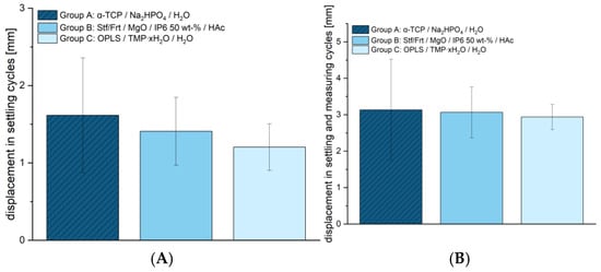 Figure 6). Within the setting cycles, deformations of 1.62 ± 0.74 mm were observed for Group A, 1.41 ± 0.44 mm for Group B, and 1.20 ± 0.30 mm for Group C. The total deformation over the setting and measuring cycles also showed similar values with 3.13 ± 1.39 mm for group A, 3.06 ± 0.70 mm for group B, and 2.94 ± 0.34 mm for group C. These results suggest that despite the significant differences in compressive strength, all materials exhibit comparable stability under cyclic loading. The congruent evaluation using an optical system can be found in