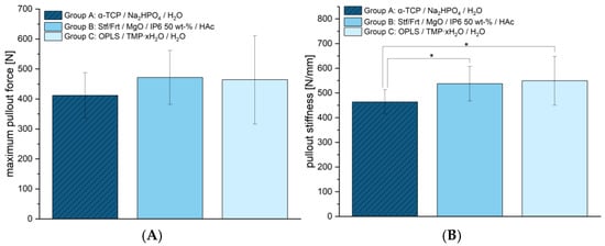 Figure 7A) was determined to show no significant differences between groups. Group A reached 411.78 ± 75.73 N, group B 471.67 ± 89.89 N, and group C 464.00 ± 147.45 N. This indicates that the screw anchors of the new cementitious adhesives have a similar strength to the reference. However, differences were found in terms of stiffness (see