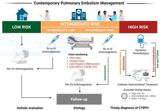 Contemporary management of pulmonary embolism in the interventional era. Created with BioRender.com (accessed on 2 April 2025). Abbreviations: BNP: brain natriuretic peptide; CTEPH: chronic thormboembolic pulmonary hypertension; echo: echocardiogram; IVC: inferior vena cava; IV: intravenously; RV/LV: right ventricle/left ventricle ratio; Sc: subcutaneously; TAPSE: tricuspid annular plane systolic excursion.