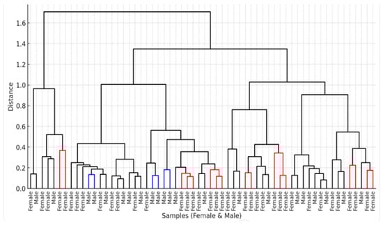 Hierarchical clustering dendrogram (Bray-Curtis Distance) of fecal samples based on their microbiota profiles. The red branches represent female samples. Blue branches indicate male samples. Black branches indicate mixed or unclear groupings, where male and female samples are clustering together.