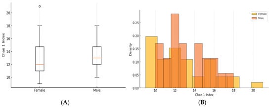 (A)—Comparison of Chao 1 Index between females and males: (B)—Histogram of Chao 1 Index for both groups.