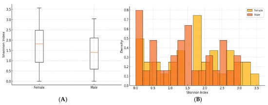 (A) Shannon Index distribution across female and male groups—Median (central line in each box), Interquartile range (IQR, the box itself), Potential outliers (dots outside the whiskers); (B)—Histogram of the Shannon Index for both—F and M groups.