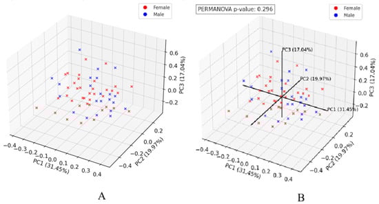 (A)—PCoA (Bray-Curtis Dissimilarity) with gender distinction—these three axes capture most of the differences between samples. (B)—PCoA (Bray-Curtis Dissimilarity) with sex, axes, and PERMANOVA results.